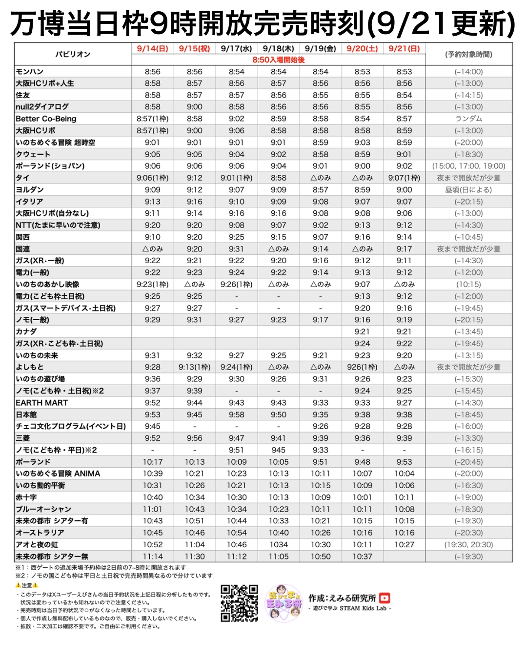 @emiru_labさんの当日枠9時開放の完売時刻一覧を確認しておきます。我が家はプロミネントカードを所持していましたが、子どもが小さいため8:30くらい夢洲着で考えていました。